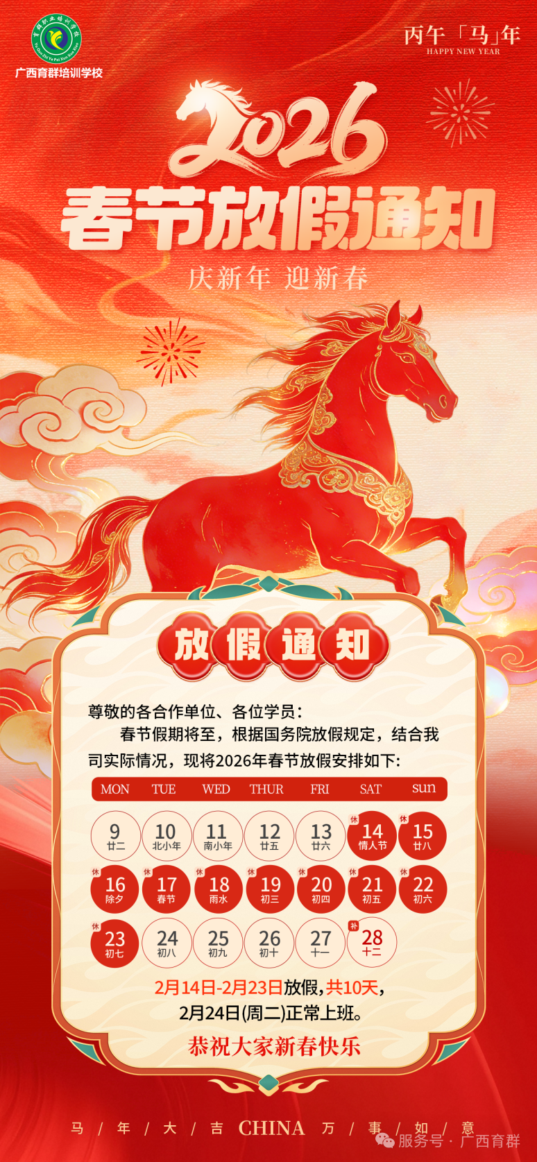 【放假时间】2 月 14 日 - 2 月 23 日(共放假 10 天)